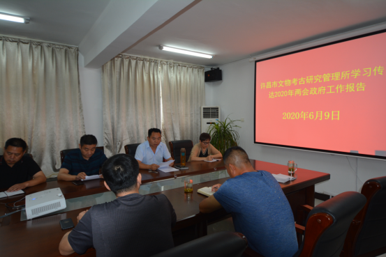 为了认真学习、领会、贯彻好全国两会精神,全面提升干部职工政治思想觉悟和责任意识。6月9日,许昌市文物考古研究管理所召开“学习传达2020年两会政府工作报告”会议,副所长文春峰主持会议并传达了两会精神及国务院总理李克强在“全国”两会上作的政府工作报告精神。所班子成员参加学习,深刻领会会议精神。