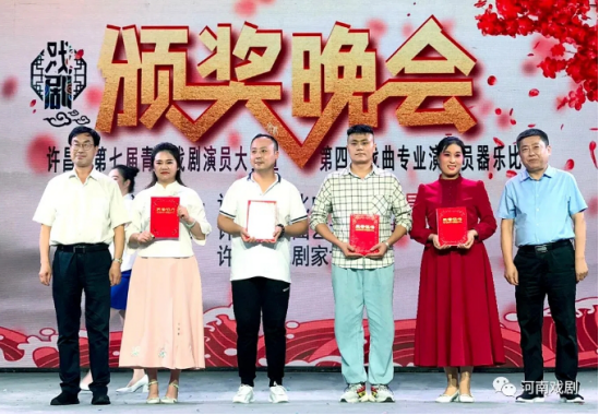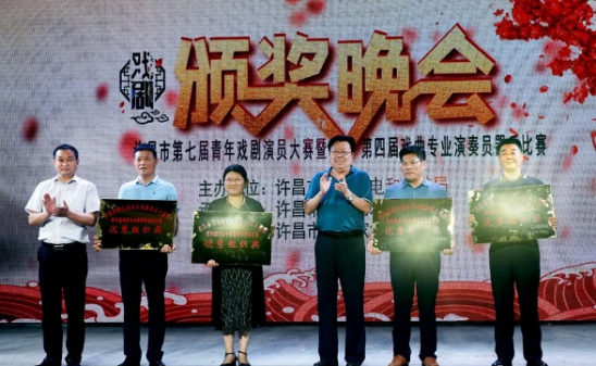 颁奖晚会在著名曲胡演奏家、国家一级琴师、“梨园春”栏目特邀首席曲胡张付中领奏的器乐合奏《大起板》“夸许昌”欢快的乐曲声中拉开了帷幕。晚会开始之前,孟照阳局长对本次大赛的获奖单位和个人表示祝贺,他说“本次大赛是全市的一次文化省会,更是各县市区和各文艺院团加强宣传和交流展示的重要平台,通过大赛,我们看到了后起之秀的雄厚实力,看到我市戏曲事业后继有人,传承有望。希望我市广大戏曲艺术工作者再接再厉,乘着戏曲艺术大发展的春风,乘势而上,不断提高自身的专业艺术水平,再造我市戏曲艺术发展新的辉煌。”随后颁发了组织奖、一等奖和二等奖荣誉证书。颁奖结束后,部分优秀节目豫剧《梵王宫》《失子惊疯》《对花枪》《泗州城》、曲剧《窦娥冤》《孽海记》、越调《大明朱元璋》《绣花屏》《芦花荡》先后登台展演,优美的唱腔,精彩的表演,博得观众阵阵掌声、喝彩声。