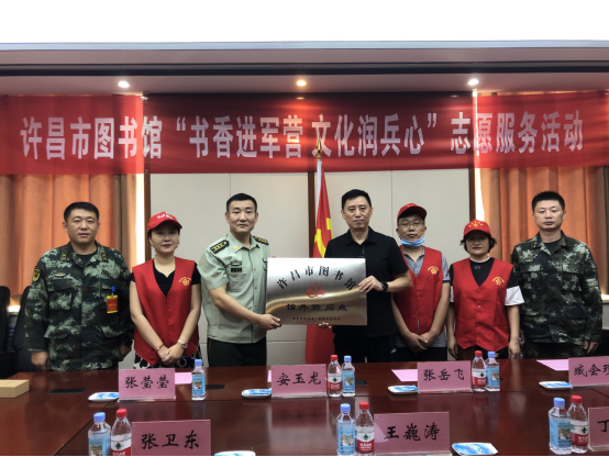 (许昌市图书馆馆长安玉龙向许昌武警支队授牌)