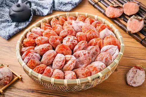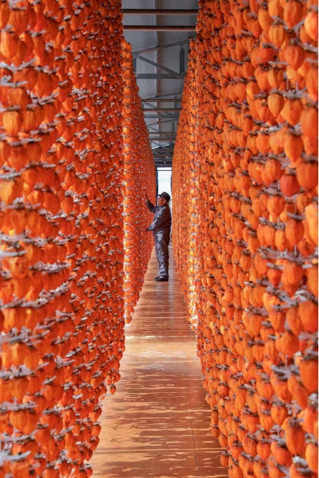 刘门村的柿饼加工和柿子醋制作工艺已非常成熟,产品不仅形成了规模,而且还做响了品牌。每年的霜降前一个月是尖柿的快速澎涨期,霜降后一周内采摘完毕,再经过筛选、折挂钩、削皮、架挂、捏心、下架、出水、潮霜等工序制成柿饼。