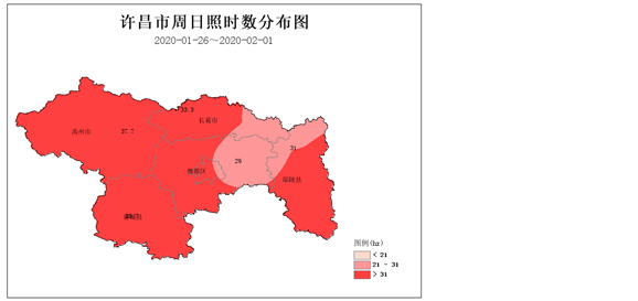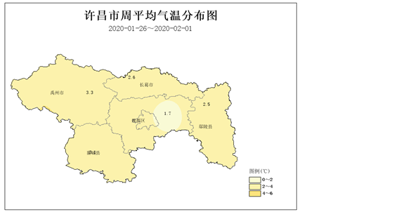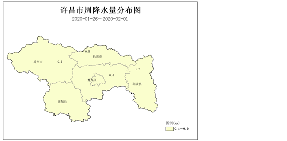 [气温] 上周各地平均气温在1.7(许昌)~3.3℃(禹州)之间,其中:鄢陵、许昌等地平均气温较低,在2℃以下,许昌最低,为1.7℃;禹州、襄城等地平均气温较高,在3℃以上,禹州最高,为3.3℃;其他大部分地区平均气温在2~3℃之间。与常年同期相比,各地平均气温较常年同期偏高0.3~1.9℃。周内各地极端最低气温值在1月31日 -6.2℃(许昌),最高气温值在1月31日 14.4℃(襄城)。各地气温距平值在0.3℃(许昌)~1.9℃(禹州)之间,较常年同期值相比许昌气温正常,禹州气温明显偏高。