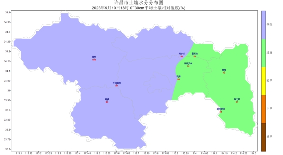 [气温]上周各地平均气温在23(大鸿寨)~27.4℃(佛耳湖)之间,其中:大鸿寨、桂村、小吕等地平均气温较低,在25℃以下,大鸿寨最低,为23℃;佛耳湖、无梁、小靳庄等地平均气温较高,在26℃以上,佛耳湖最高,为27.4℃;其他大部分地区平均气温在25~26℃之间。周内各地最低气温值在9月3日16.7℃(小吕),最高气温值在9月4日35.4℃(蒋李集)。各地气温距平值在2.4℃(许昌)~3.1℃(禹州)之间,较常年同期值相比许昌气温异常偏高,禹州气温异常偏高。