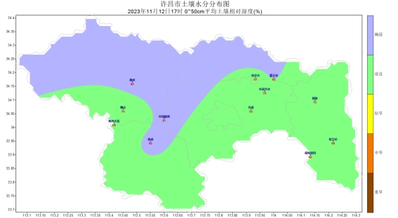 [降水]上周各地降水量在1.6~46.1mm之间,其中,杨湾、钧台办、大周等地降水量相对较多,在43mm以上,杨湾最多,为46.1mm;圈刘、金桥、火龙等地降水量相对较少,在3mm以下,圈刘最少,为1.6mm;其他大部分地区降水量在3~43mm之间。各地降水距平百分率在59.5%(鄢陵)~243.5%(禹州)之间,较常年同期值相比鄢陵降水异常偏多,禹州降水异常偏多。最长连续降水日数3天(小召2023-11-05至2023-11-07),最长连续无降水日数5天(屯沟2023-11-06至2023-11-10)。
