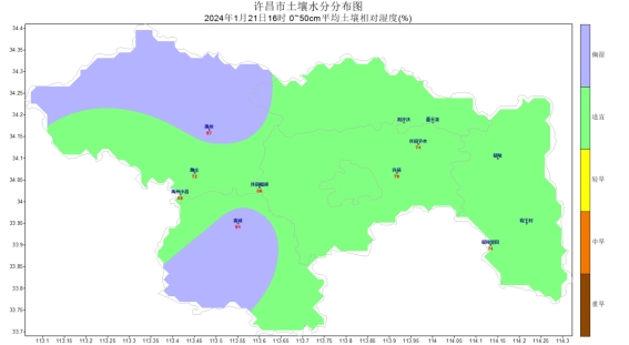 [降水]上周各地降水量在10.4~16.7mm之间,其中,禹州、许昌、鄢陵等地降水量在15mm以上,许昌最多,为16.7mm;长葛、襄城等地降水量在14mm以下,襄城最少,为10.4mm;其他大部分地区降水量在14~15mm之间。各地降水距平百分率在235.5%(襄城)~973.3%(禹州)之间,较常年同期值相比襄城降水异常偏多,禹州降水异常偏多。最长连续降水日数4天(禹州2024-01-16至2024-01-19),最长连续无降水日数2天(襄城2024-01-14至2024-01-15)。