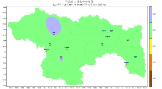 [气温]上周各地平均气温在-3.8(龙源)~0.9℃(丁营)之间,其中:龙源、陈化店、马坊等地平均气温较低,在-2.8℃以下,龙源最低,为-3.8℃;杨湾、丁营、城关等地平均气温较高,在0.5℃以上,丁营最高,为0.9℃;其他大部分地区平均气温在-2.8~0.5℃之间。周内各地极端最低气温值在1月23日-13.8℃(龙源),最高气温值在1月26日12.7℃(只乐)。各地气温距平值在-3.0℃(鄢陵)~-0.9℃(襄城)之间,较常年同期值相比鄢陵气温异常偏低,襄城气温偏低。