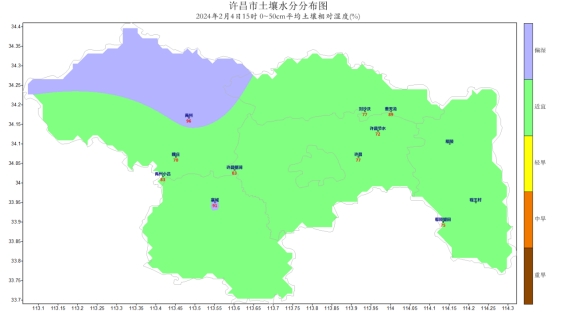 [降水]上周各地降水量在6.1~15mm之间,其中,鄢陵等地降水量在14mm以上,鄢陵最多,为15mm;、许昌、襄城、禹州、长葛等地降水量在11mm以下,禹州最少,为6.1mm;其他大部分地区降水量在11~14mm之间。各地降水距平百分率在408.3%(禹州)~733.3%(鄢陵)之间,较常年同期值相比禹州降水异常偏多,鄢陵降水异常偏多。最长连续降水日数4天(鄢陵2024-01-31至2024-02-03),最长连续无降水日数3天(鄢陵2024-01-28至2024-01-30)。