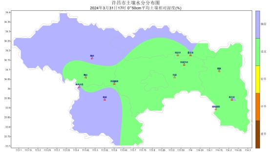 [降水]上周各地降水量在13.8~24.3mm之间,其中,长葛、禹州等地降水量在19mm以上,长葛最多,为24.3mm;襄城、鄢陵、许昌等地降水量在16mm以下,襄城最少,为13.8mm;其他大部分地区降水量在16~19mm之间。各地降水距平百分率在236.6%(襄城)~683.9%(长葛)之间,较常年同期值相比襄城降水异常偏多,长葛降水异常偏多。最长连续降水日数5天(茨沟2024-03-24至2024-03-28),最长连续无降水日数7天(马坟2024-03-24至2024-03-30)。