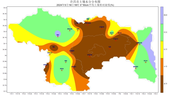 [气温]上周各地平均气温在22.5(龙源)~25.8℃(佛耳湖)之间,其中:大鸿寨、龙源、桂村等地平均气温较低,在23℃以下,龙源最低,为22.5℃;佛耳湖、金桥、钧台办等地平均气温较高,在25℃以上,佛耳湖最高,为25.8℃;其他大部分地区平均气温在23~25℃之间。周内各地最低气温值在5月16日8.0℃(龙源),极端最高气温值在5月17日39.7℃(褚河)。各地气温距平值在2.7℃(许昌)~3.9℃(禹州)之间,较常年同期值相比许昌气温异常偏高,禹州气温异常偏高。