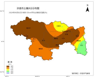 [降水]上周各地降水量在0.1~28.2mm之间,其中,苌庄、庄沟、函岭村等地降水量在24mm以上,苌庄最多,为28.2mm;陈化店、苏桥、庾河等地降水量在0.5mm以下,其他大部分地区降水量在0.5~24mm之间。各地降水距平百分率在-99%(鄢陵)~-34.7%(禹州)之间,较常年同期值相比鄢陵降水异常偏少,禹州降水明显偏少。最长连续降水日数2天(丁营2024-05-26至2024-05-27),最长连续无降水日数6天(金桥2024-05-27至2024-06-01)。