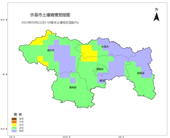 [降水]上周全市各地降水量在0.0~19.5mm之间,其中:二高、方岗、坡胡等地降水量在2mm以上,彭店最多,为19.5mm;神垕、白沙、金桥各地无有效降水,其他地区降水量在2.1mm以下。各地降水距平百分率在-96.8%(许昌)~-78.2%(鄢陵)之间,较常年同期值相比许昌降水异常偏少,鄢陵降水异常偏少。