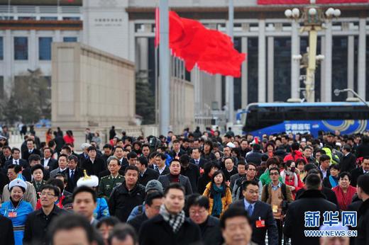 ,全国政协十二届二次会议在北京人民大会堂举行闭幕会。这是委员抵达天安门广场。