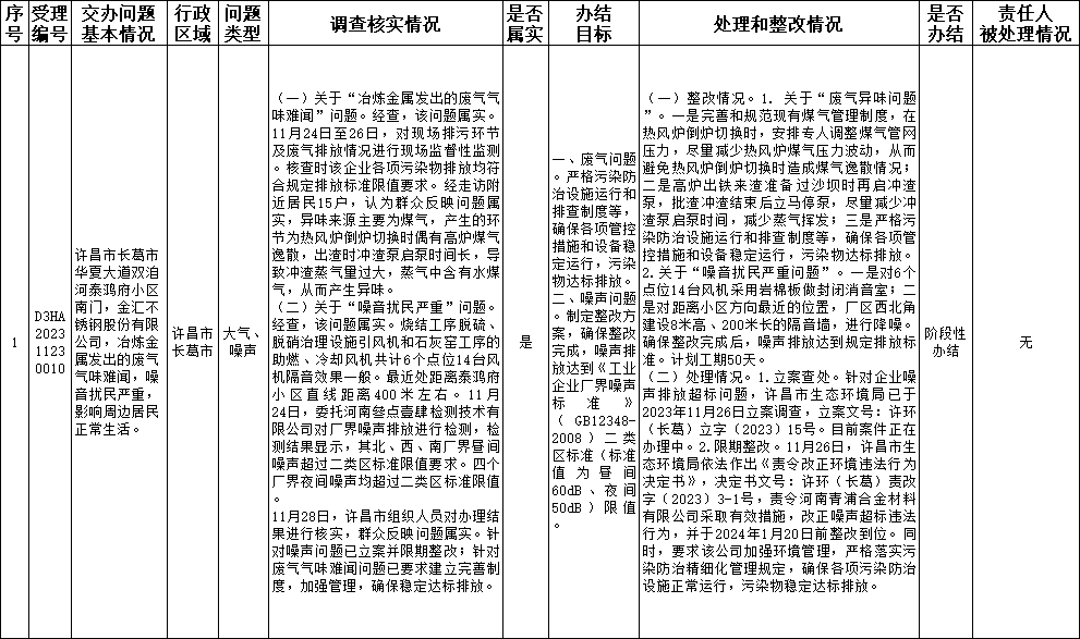 11月24日,中央第二生态环境保护督察组向我市交办第二批1个群众举报件,截至12月3日,正在办理1件,查处和整改情况已按要求进行公开,具体内容请查阅许昌市人民政府网站。
