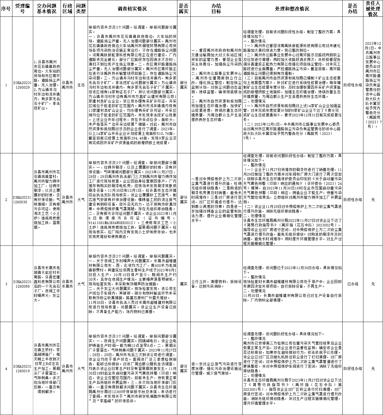 11月27日,中央第二生态环境保护督察组向我市交办第五批4个群众举报件,截至12月6日,已办结1件,正在办理3件,查处和整改情况已按要求进行公开,具体内容请查阅许昌市人民政府网站。