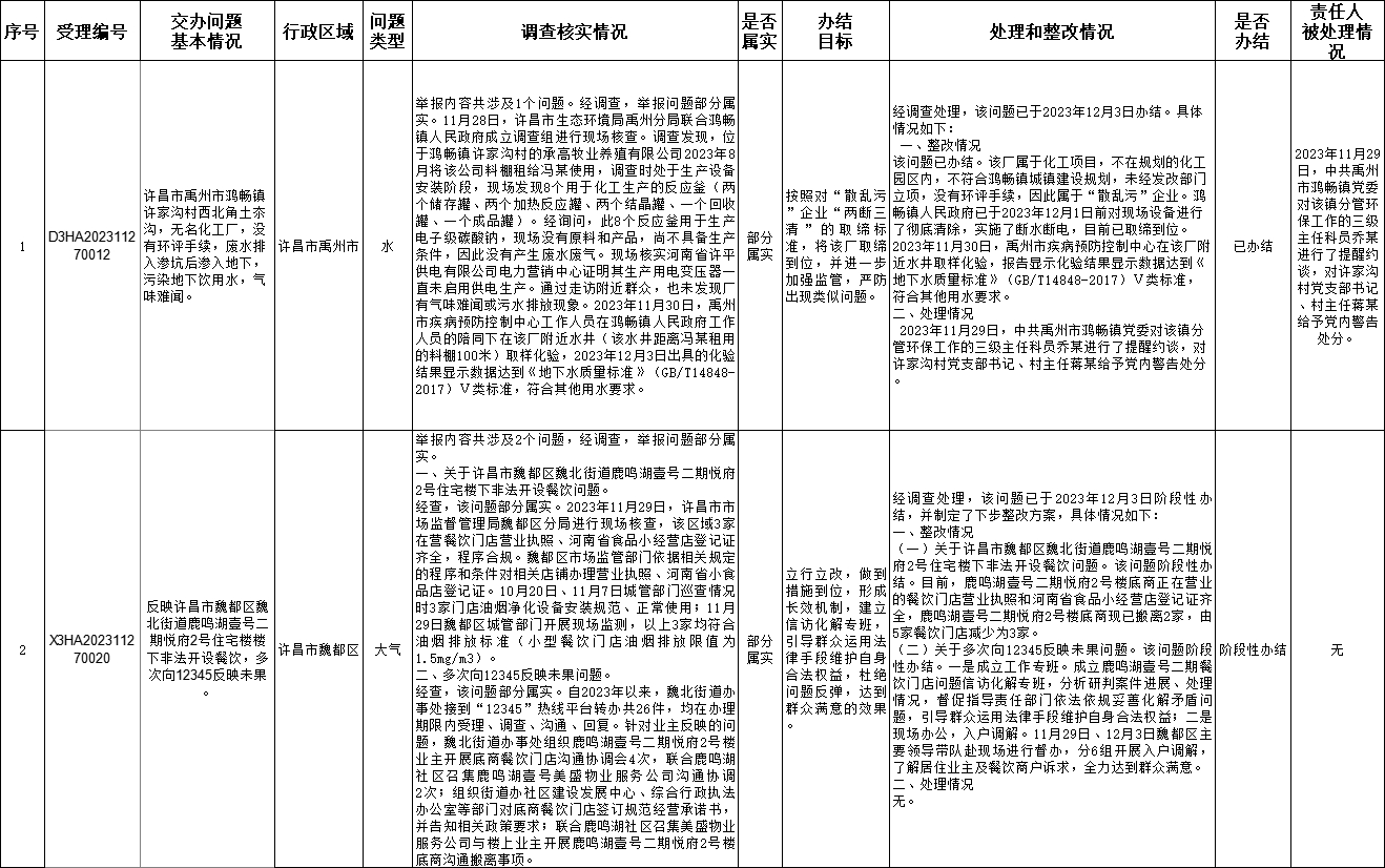 11月28日,中央第二生态环境保护督察组向我市交办第六批2个群众举报件,截至12月7日,已办结1件,正在办理1件,查处和整改情况已按要求进行公开,具体内容请查阅许昌市人民政府网站。