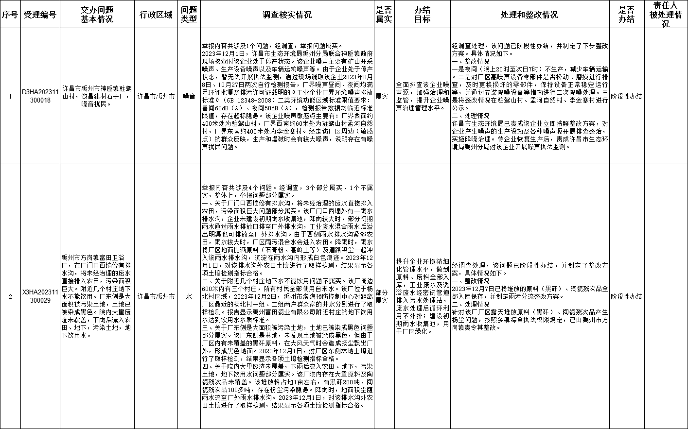 12月1日,中央第二生态环境保护督察组向我市交办第九批2个群众举报件,截至12月10日,正在办理2件,查处和整改情况已按要求进行公开,具体内容请查阅许昌市人民政府网站。