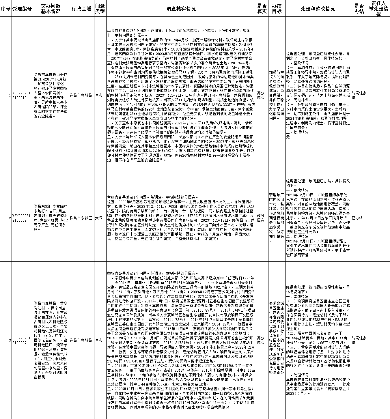 12月11日,中央第二生态环境保护督察组向我市交办第十九批3个群众举报件,截至12月20日,已办结1件,正在办理2件,查处和整改情况已按要求进行公开,具体内容请查阅许昌市人民政府网站。