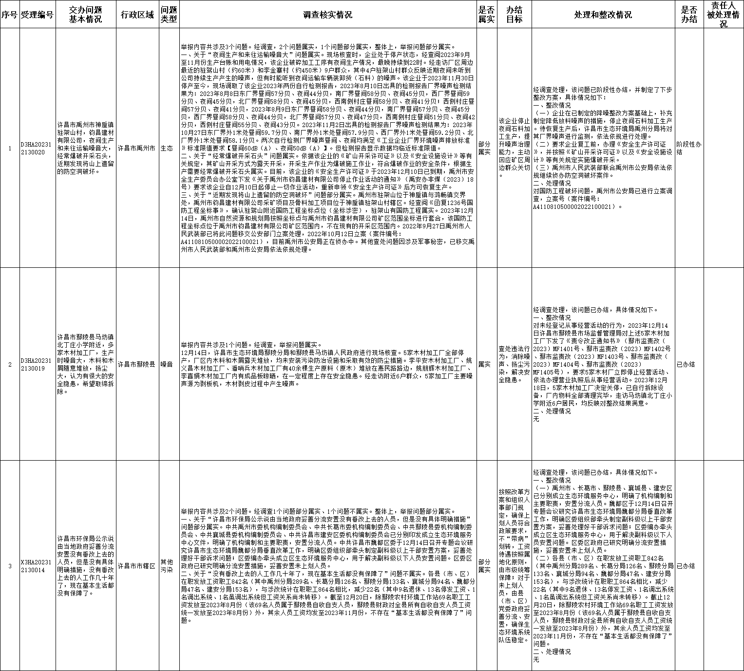 12月14日,中央第二生态环境保护督察组向我市交办第二十二批3个群众举报件,截至12月23日,已办结2件,正在办理1件,查处和整改情况已按要求进行公开,具体内容请查阅许昌市人民政府网站。