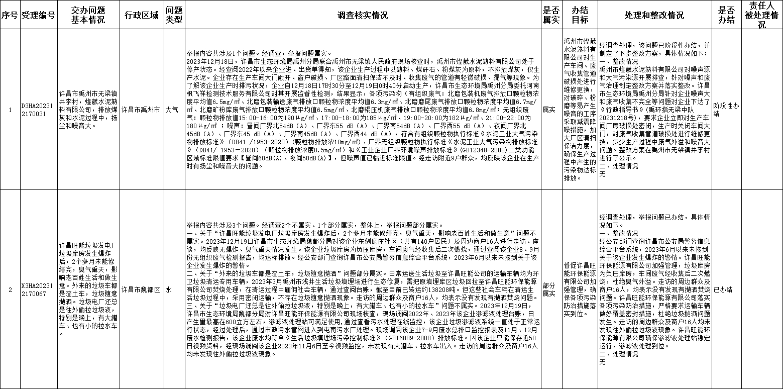 12月18日,中央第二生态环境保护督察组向我市交办第二十六批2个群众举报件,截至12月27日,已办结1件,正在办理1件,查处和整改情况已按要求进行公开,具体内容请查阅许昌市人民政府网站。