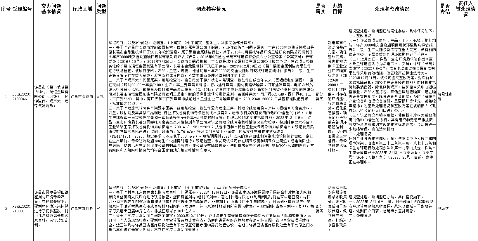 12月19日,中央第二生态环境保护督察组向我市交办第二十七批2个群众举报件,截至12月28日,已办结1件,正在办理1件,查处和整改情况已按要求进行公开,具体内容请查阅许昌市人民政府网站。