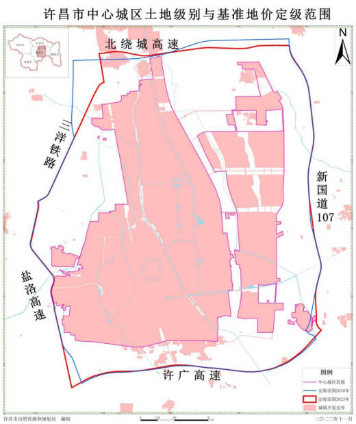2023年11月,根据《河南省自然资源厅办公室关于开展城镇土地级别与基准地价更新调整工作的通知》及《河南省城镇土地级别与基准地价更新调整技术方案》要求,拟定我市地价更新调整工作方案和技术方案。2023年11月-2024年1月,通过收集18个行业部门的基准资料、定级资料、估价资料和各要素点现场实地调研,搭建了定级指标体系及权重,开展级别划分和基准地价评估,形成初步成果。2024年1月-2024年3月,成果完成向社会公开征求意见、专家论证、风险评估、合法性审查等工作。2024年4月,通过《许昌市人民政府关于公布许昌市中心城区城镇土地级别与基准地价更新调整成果的通知》(许政〔2024〕8号)公布实施。