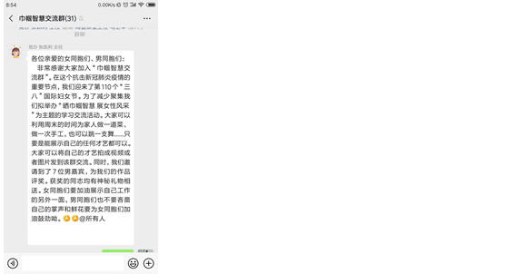 在以习近平同志为核心的党中央带领全党全军全国各族人民抗击新冠肺炎疫情的重要节点,我们迎来了第110个“三八”国际妇女节。为深入贯彻习近平总书记重要讲话精神和党中央决策部署,3月7日、8日,市文广旅局结合实际,利用周末的时间,以线上微信群为载体,积极组织开展以“晒巾帼智慧 展女性风采”为主题的学习交流活动。