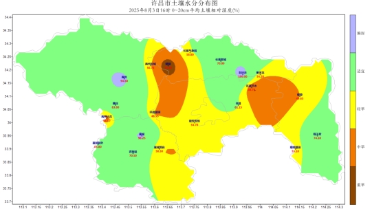 [土壤墒情]根据2025年8月3日16时0-20cm自动土壤水分监测资料显示,全市不旱测站占比48%;干旱测站占比52%;与上周日相比,缺墒测站比例增加了37个百分点。