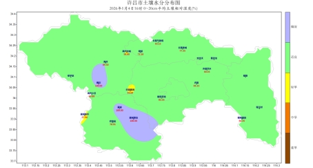 [土壤墒情]2026年1月4日16时自动土壤水分监测资料显示:目前全市大部墒情适宜,土壤表层(0-20厘米)墒情适宜测站比例为62%,偏湿测站比例为19%,干旱测站比例为19%。